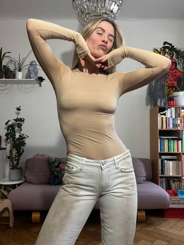 Přiléhavý top s dlouhým rukávem vyrobený z lehkého, měkkého a pružného žerzeje se sportovním nádechem. Tato vrstva oblečení, kterou si zamilujete, má kulatý výstřih a zakončené okraje.