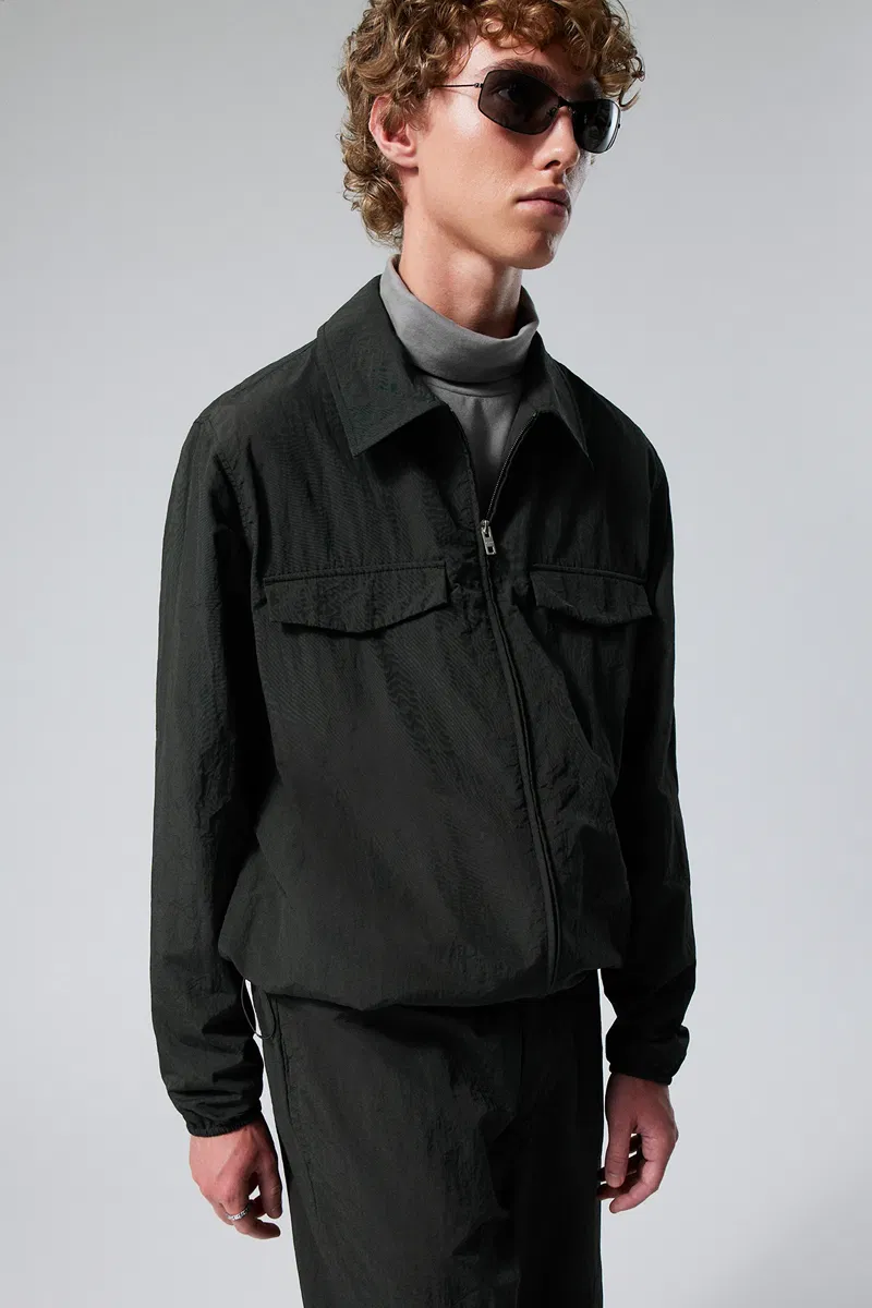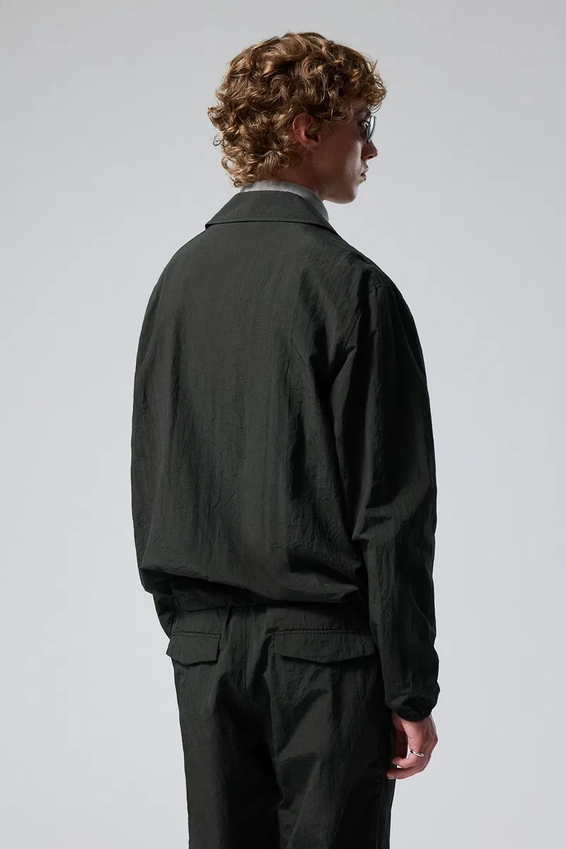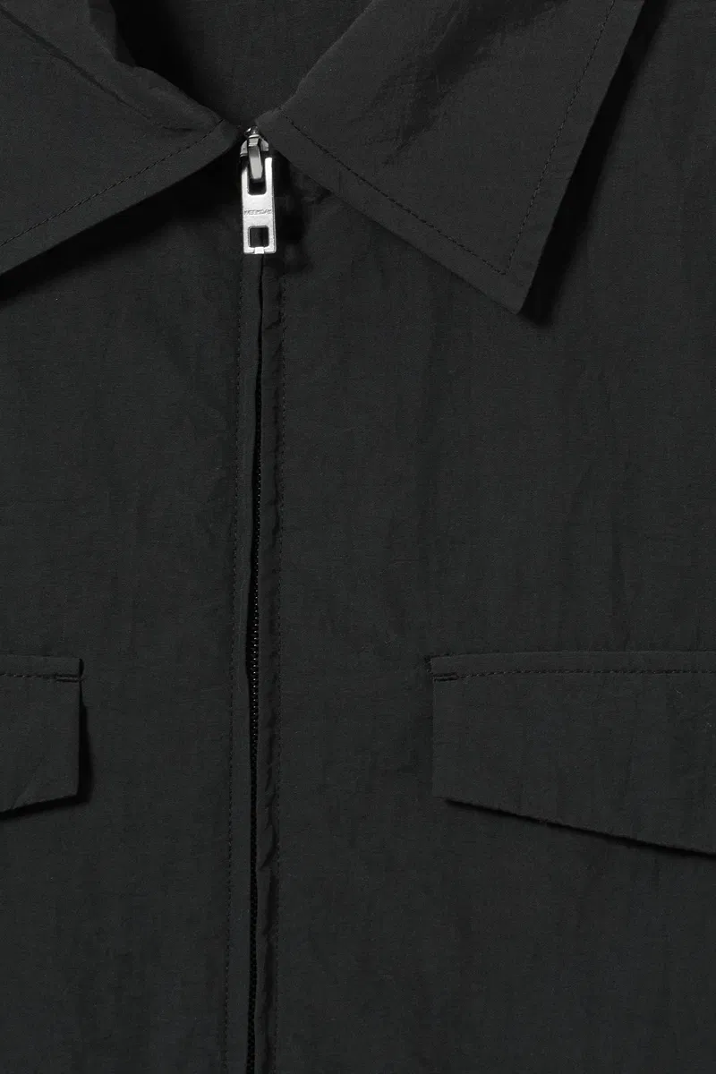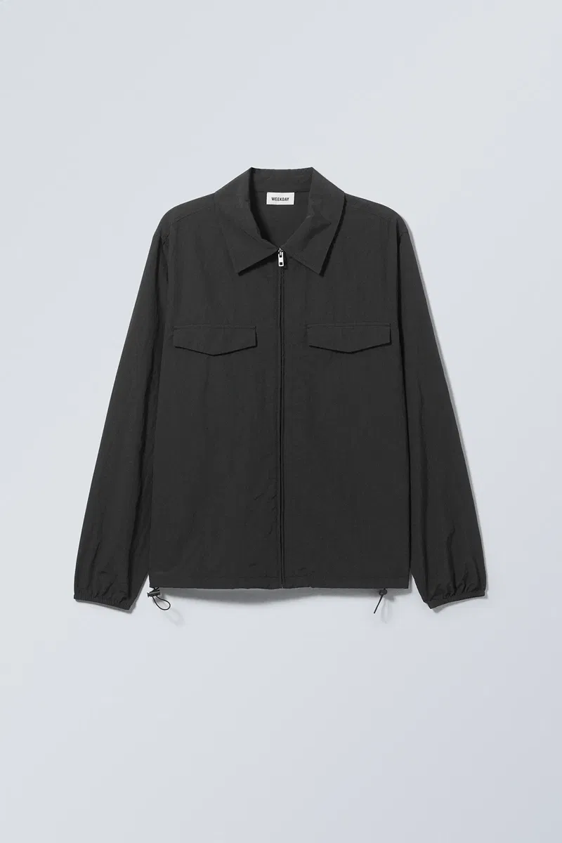 A loose fit zip up overshirt made from a lightweight recycled polyamid. This go-to layer has a sturdy metal front zipper, a drawstring waistline and cuffs, a shirt collar, two chest flap pockets and a hidden pocket in the right arms inner side seam.