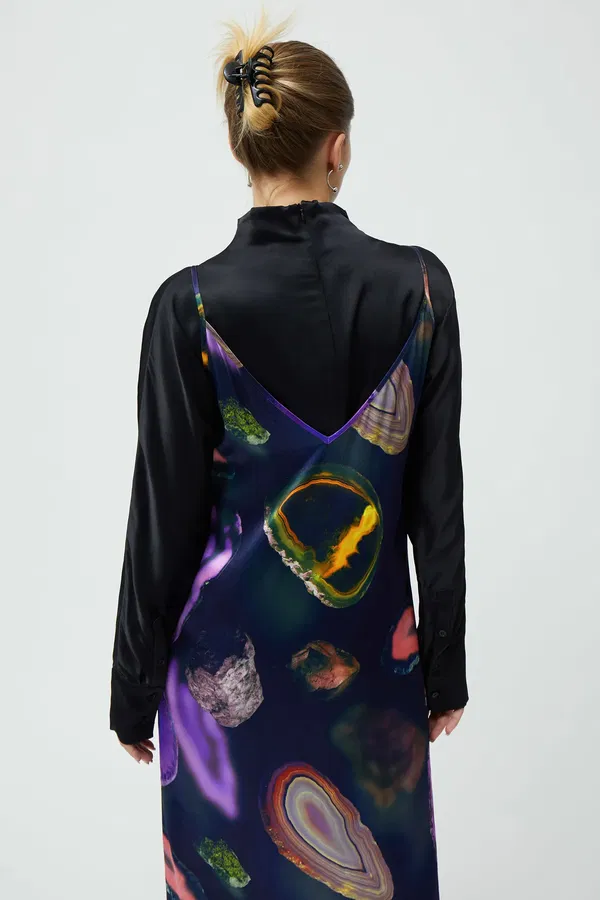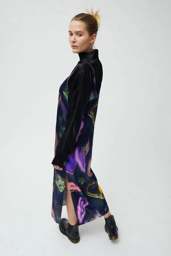 Šaty Sierra jsou jemné viskózové šaty vyrobené z lesklého materiálu s jemně mačkanou strukturou. Mají výstřih do V a zadní výstřih. Modelka má na sobě velikost small, která měří obvod hrudníku 90 cm a délku 97 cm.