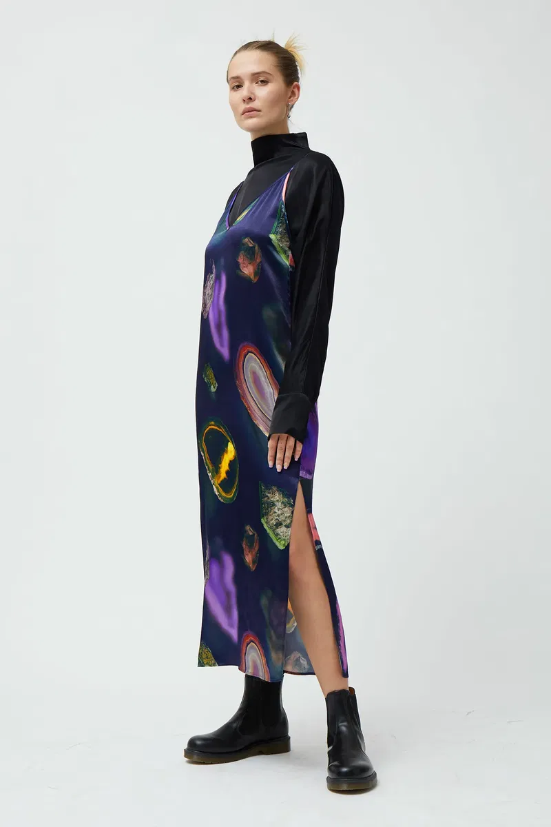 The Sierra Dress is a fine slip-on dress crafted in a lustrous material with a delicately crinkled structure. It has a V-neck and backline. The model wears size extra small, that measures 90 cm in chest circumference and 97 cm in length.