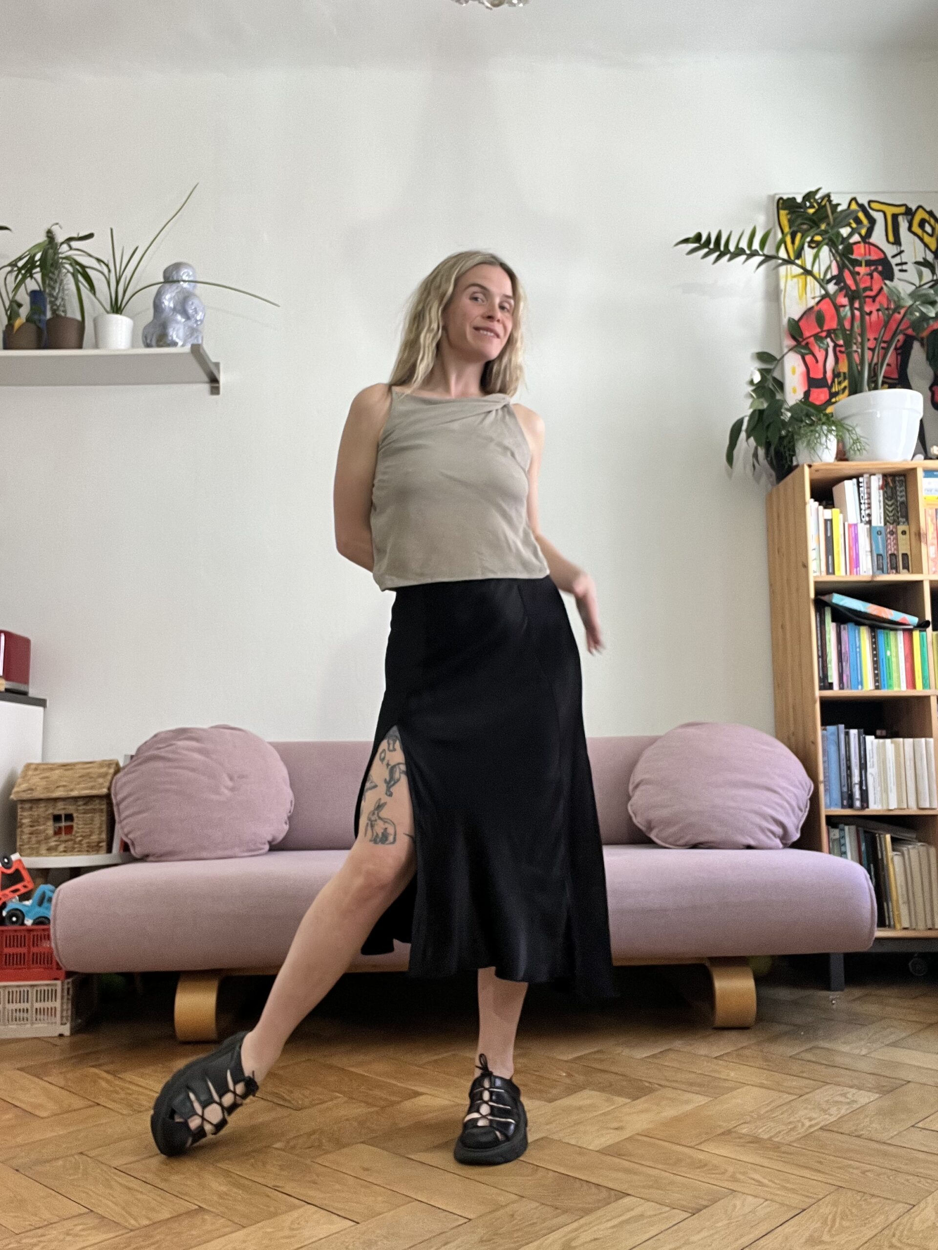 Tato sukně okouzlí svým lesklým saténovým materiálem ze 100% přírodní viskózy. S pohodlným elastickým pasem a předním rozparkem se stane “must have” kousek ve vašem kapsulovém a udržitelném šatníku.